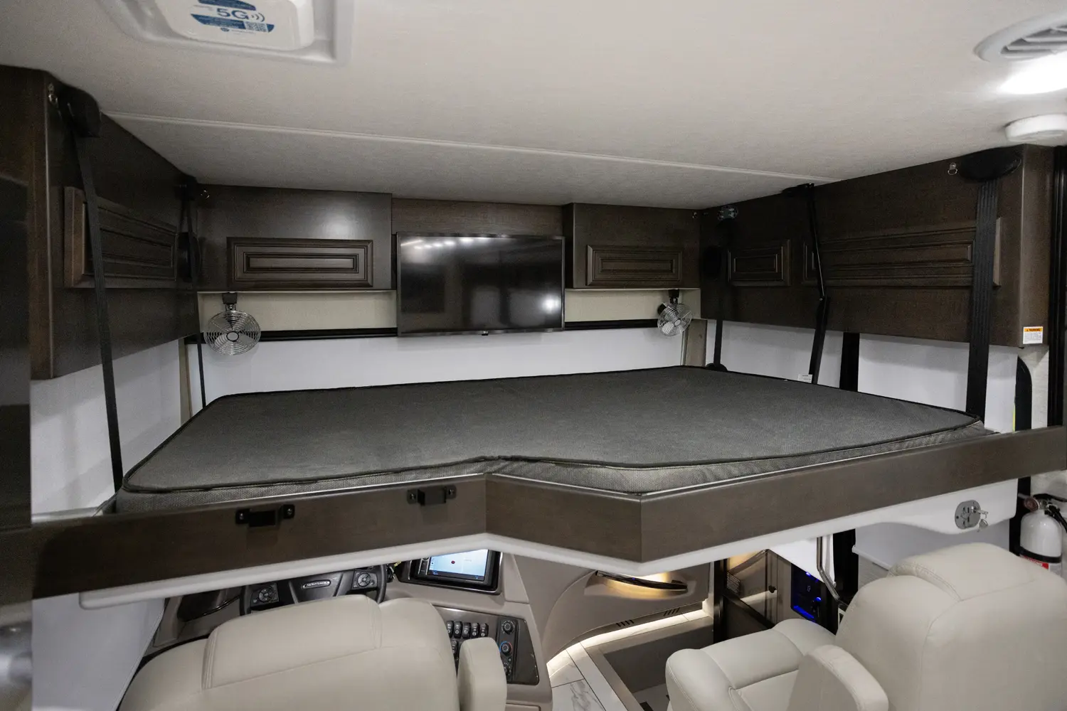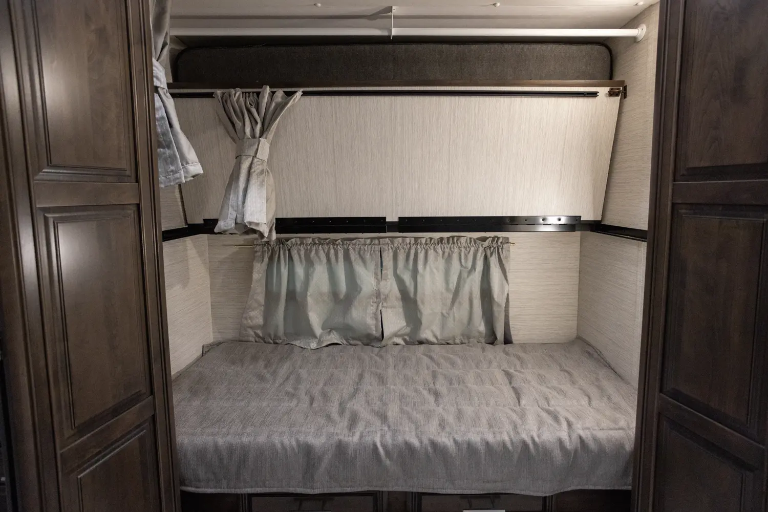 The Berkshire XLT 45A is a four-slide bunkhouse model with two full bathrooms. The rear large full bath includes a shower, vanity with dual sinks, overhead cabinets, and stacking washer/dryer. The main bedroom has a slideout, 72" x 80" Tilt-a-View king bed, plus a dresser, wardrobe cabinet, 43" TV, and overhead cupboards. The second full bath has a shower, vanity sink, medicine cabinet, and commode. Across across from this bathroom is the bunk room/wardrobe combo. The kitchen provides a convection microwave, induction cooktop, and residential-style refrigerator. Just over the cockpit, you'll find a unique drop-down bed that provides an additional sleeping surface at night.