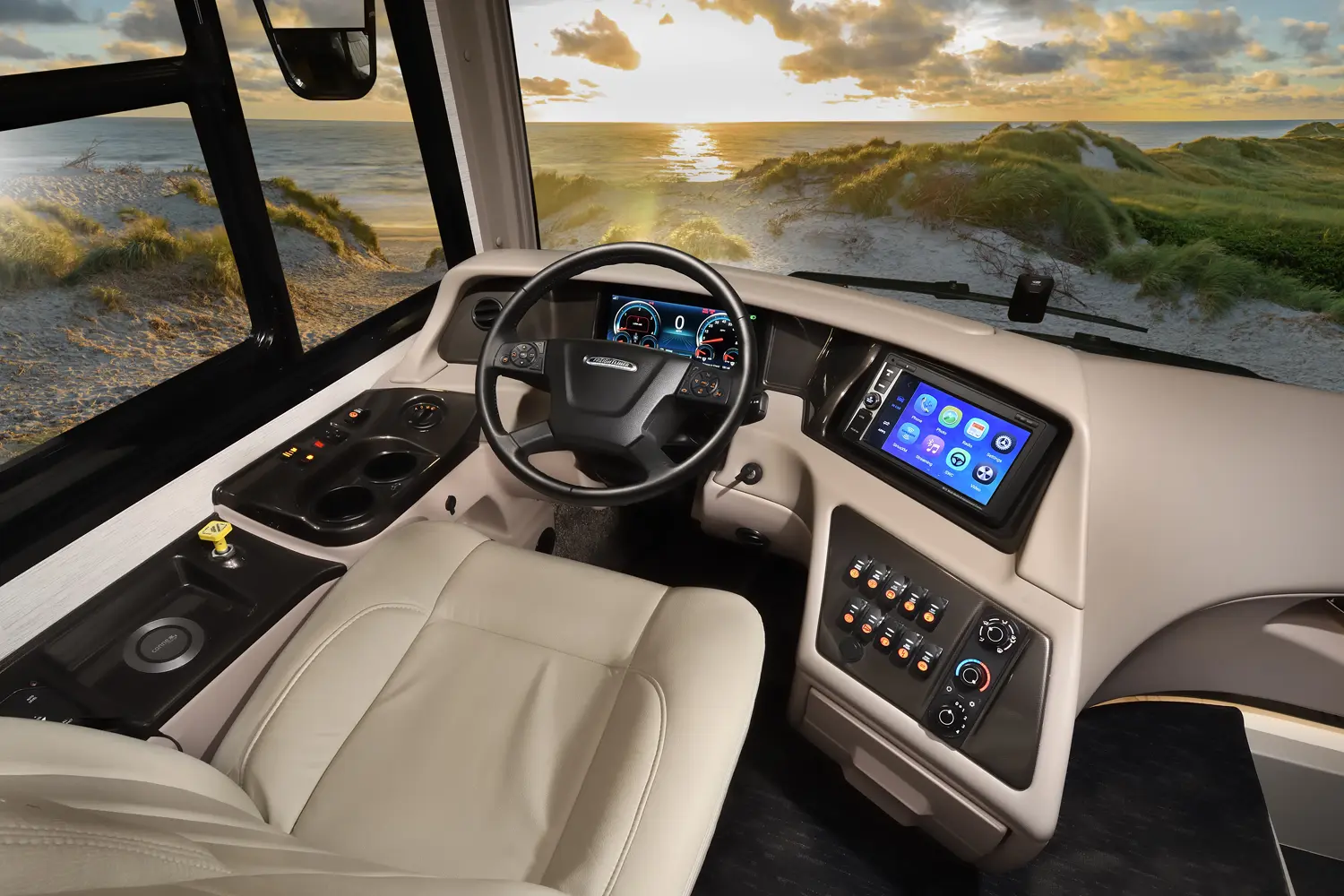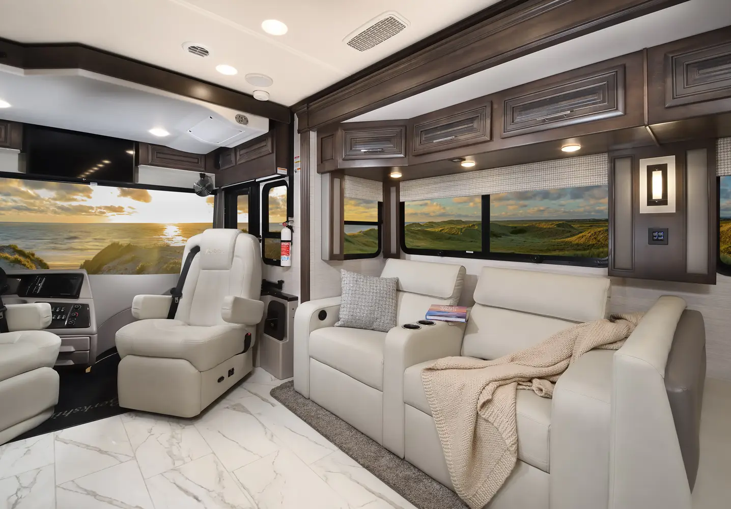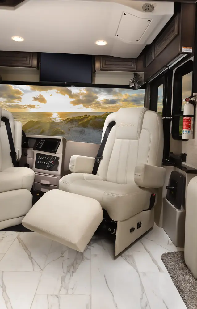 The Berkshire XLT 45E is a five-slide bunkhouse model. The large full rear bath includes a shower, vanity, cabinets, and stacking washer/dryer. Within the bathroom is a slideout bunk room/wardrobe combo. Each bunk is 30" x 73" and has its own TV. The main bedroom has a slideout, 72" x 80" Tilt-a-View king bed, plus a dresser, wardrobe cabinet, 43" TV, and overhead cupboards. Moving toward the living area is a half bath with vanity sink, medicine cabinet, and commode. The kitchen is fully equipped with a convection microwave, induction cooktop, and residential-style refrigerator. Just over the cockpit, you'll find a unique drop-down bed that provides an additional sleeping surface.