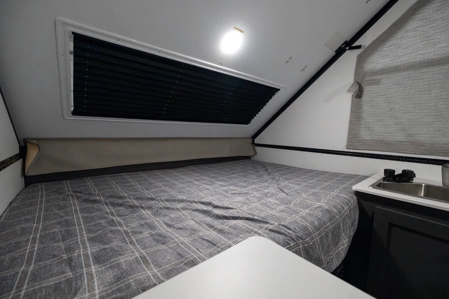 The Flagstaff T12ST is a classic A-frame built for simple, efficient camping. Inside, a front dinette offers comfortable seating and converts for added sleeping space, while a cooktop and sink provide convenient meal prep. In the rear, a flip-up 54" x 80" bed creates a spacious sleeping area. Outside, an easy-reach front storage trunk gives you plenty of room for gear and cargo.