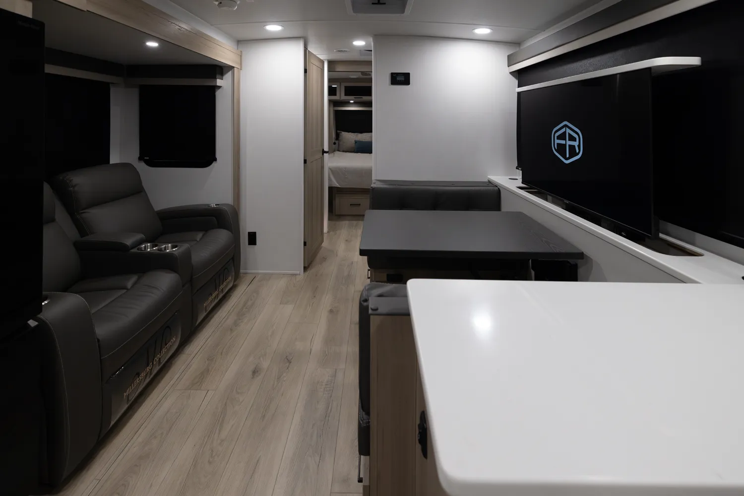 The Flagstaff 29DBH features a front bedroom with a true queen bed and a large master bathroom with shower. The spacious living area and kitchen include theater seating and a dinette for comfort and dining. A rear half-bath and segregated bunk room provide privacy and convenience, making the 29DBH ideal for families seeking versatile space and comfort on the road.