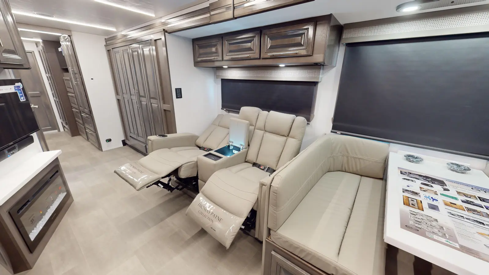 The Georgetown 36K7 by Forest River is designed for family comfort with two full baths and bunks. The kitchen features a farmhouse sink, 3-burner cooktop, microwave, and residential refrigerator. Enjoy entertainment in the theater seats across from a TV. The mid-ship full bath is across from the bunk beds. The bedroom offers a king bed and optional washer/dryer, plus a full master bath. The cab features swivel captain seats, a table, and a power overhead bunk.