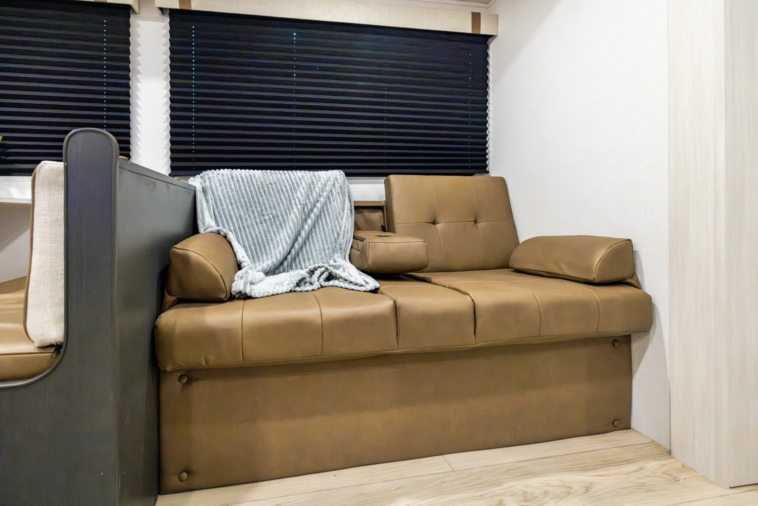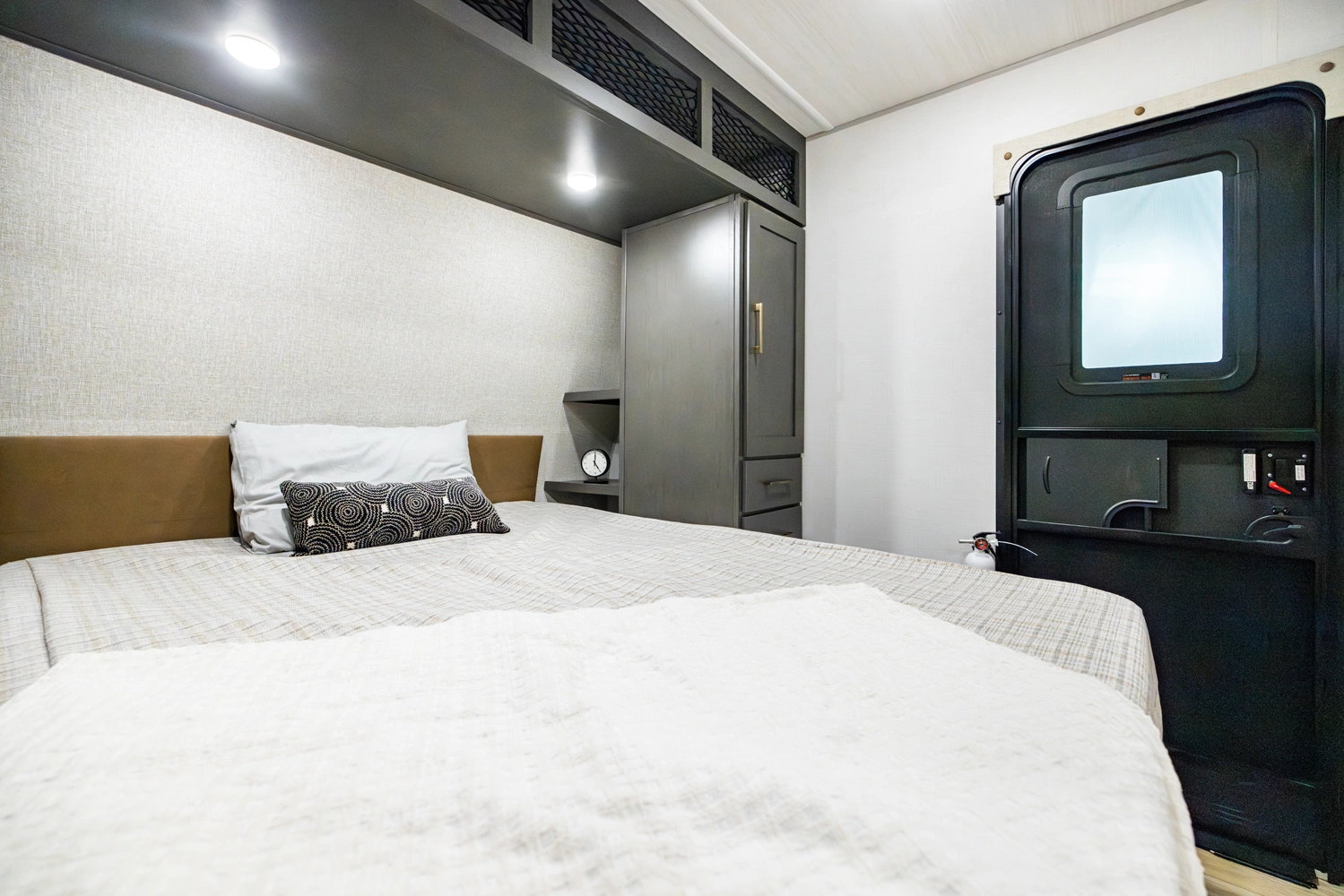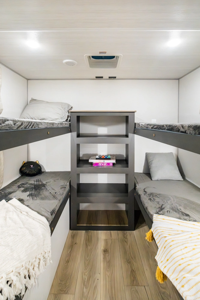The Ibex New Trail Edition TRAIL28 features a front queen bed, central living area with sofa and dinette, a full kitchen, and a walk-through bath. A private rear bunk room offers four bunks and extra storage. Includes washer/dryer prep, tankless water heater, 50-amp service, and designed with superior construction.