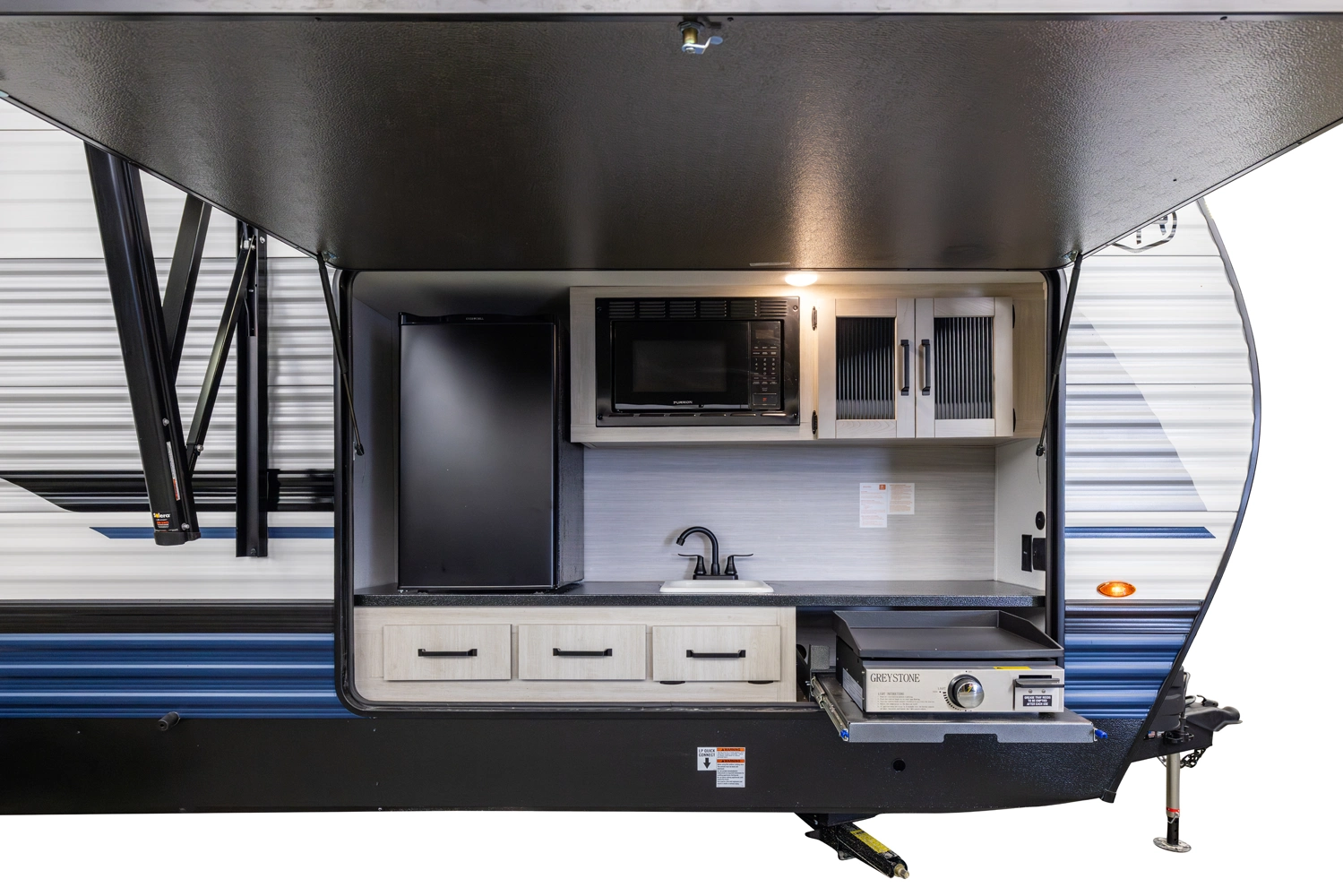 This Toy Hauler is a Travel Trailer that will grant you a vast majority of the layout to be optional cargo area. With 11' of cargo space in the garage, make sure to bring all the toys. The Flip Up Sleeper Sofa's in the garage of this floorplan provide sleeping areas for you and your guests. An optional queen bed electric lift can also be added to the garage for more sleeping quarters, too. Furthermore, an optional outside kitchen can be added for those of you who like to cook in nature.