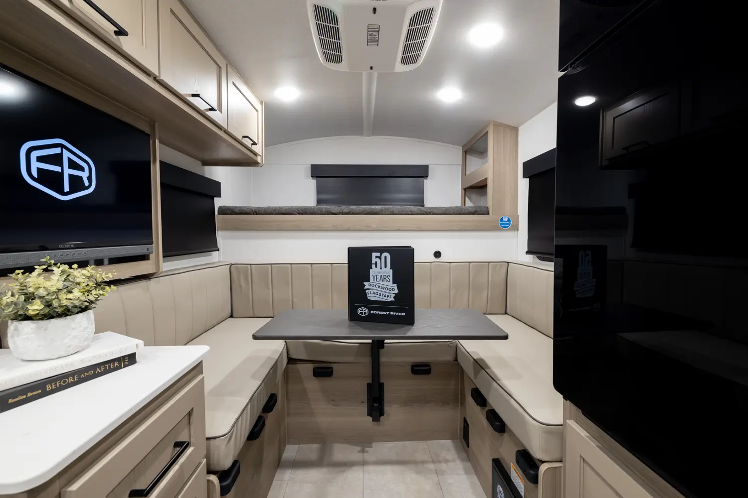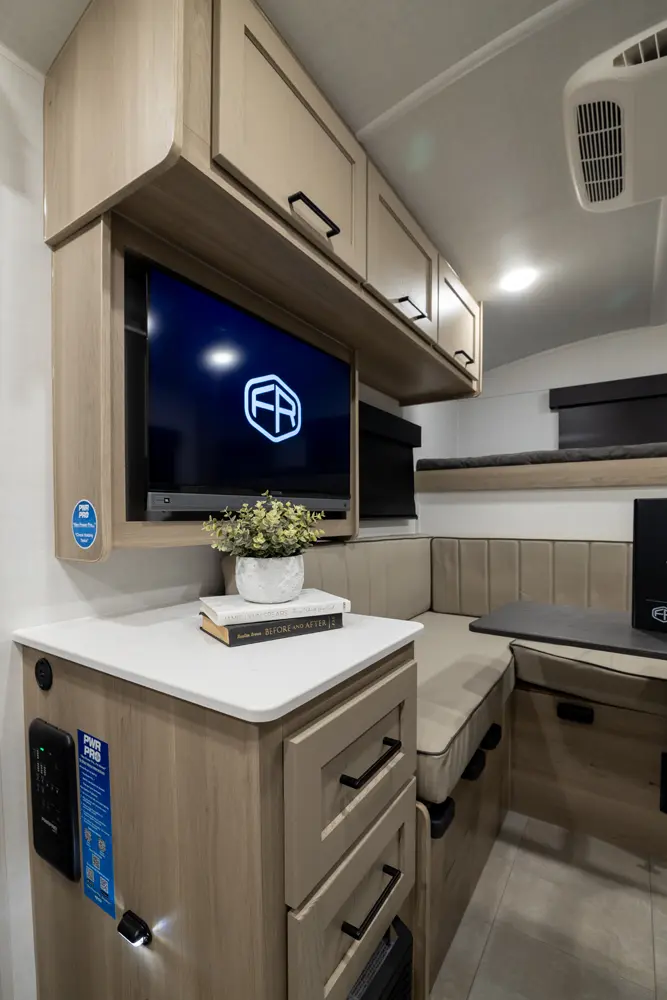 The 15RDG Offers a huge 80” by 54” U-shaped dinette that converts to a bed. A flip-up bunk that doubles as shelf storage when not in use. A thoughtful convection microwave, sink & stove top inside as well as a massive outdoor rear kitchen. With The convenience of a wet bath this model delivers comfort, versatility and fun wherever the road takes you.