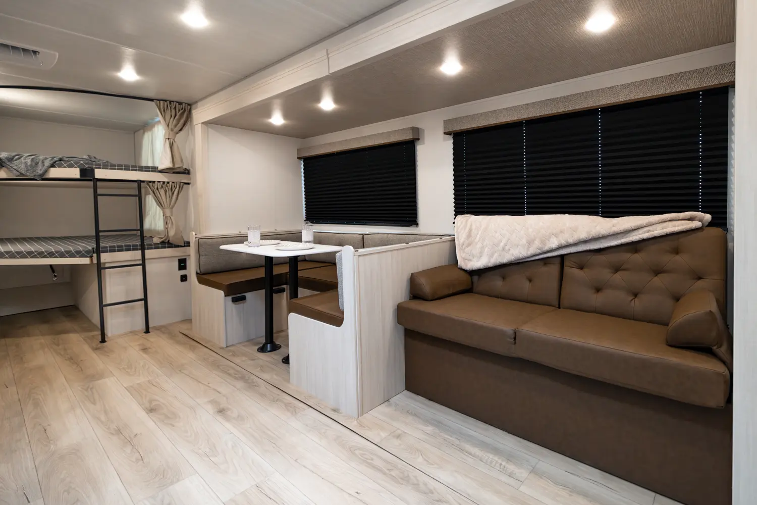 This 33' 4" travel trailer features a front queen bed, a convertible U-shaped dinette, and a rear corner bunkhouse with a ladder-accessible top bunk. The kitchen includes a 10 cu. ft. 12V refrigerator, oven, and stovetop. Exterior amenities include a 19' electric awning, outdoor camp kitchen, and a hot & cold spray port.