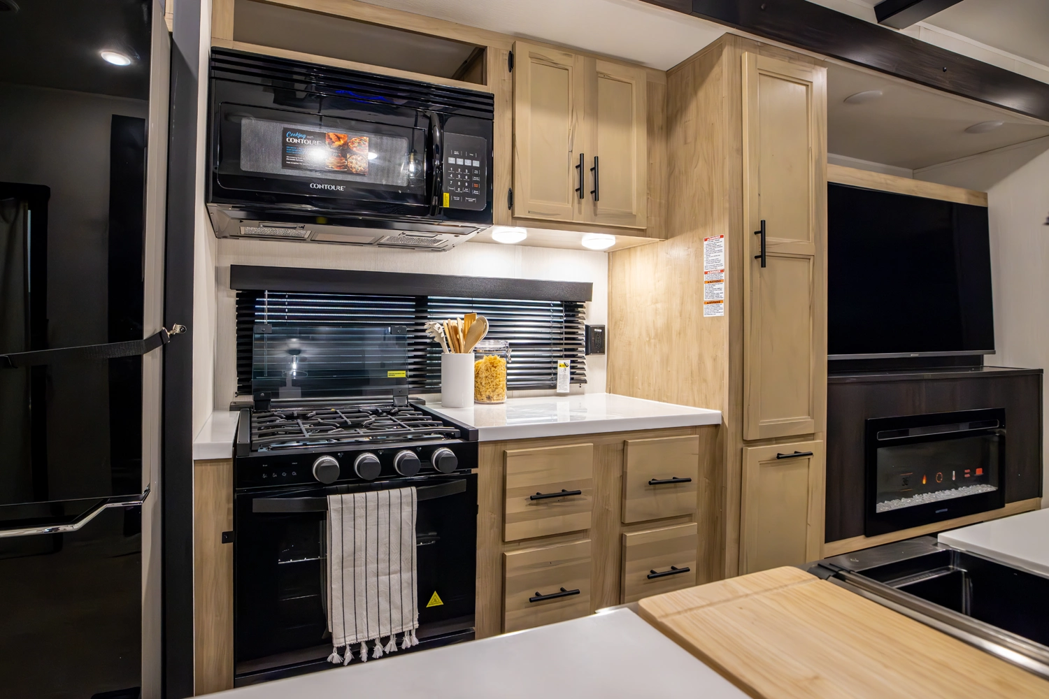 • Cherokee Black Label Timberwolf (Deep Tinted Frameless Automotive Glass Windows, High Gloss Gel Coat Exterior Sidewalls, Multicolor Reading Lights, Pillowtop Mattress Upgrade, Thermo Foil Arctic Insulation, Wall Controlled Power Shades for Living Room and Kitchen)