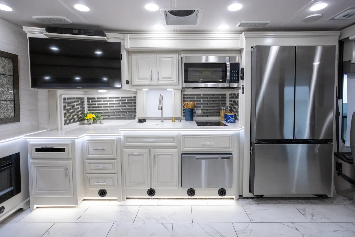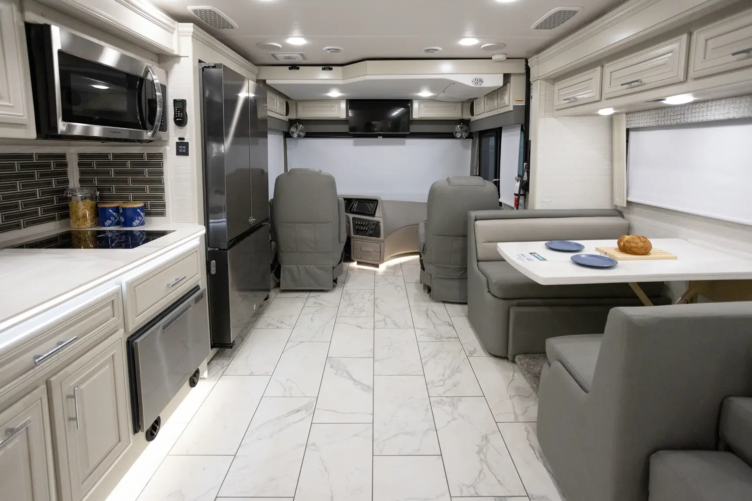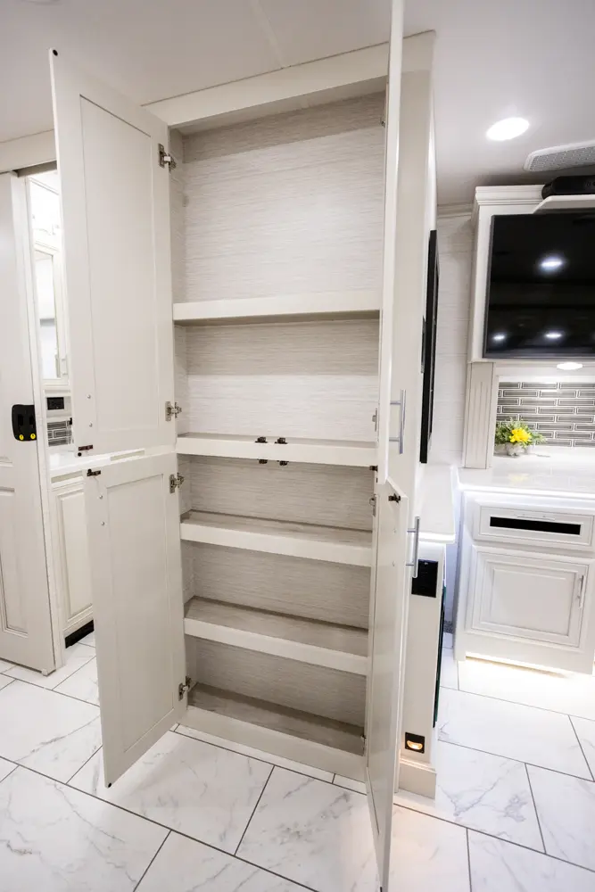 The Berkshire XL 40E is a three-slide bunkhouse model with two full bathrooms. The rear full bath includes a shower, vanity sink with medicine cabinet, and stacking washer/dryer. The bedroom has a slideout, 72" x 80" Tilt-a-View king bed, plus a dresser, wardrobe cabinet, TV, and overhead cupboard. The second full bath sits across from the bunk room/wardrobe combo. The kitchen is fully equipped, with a convection microwave, induction cooktop, and residential-style refrigerator.