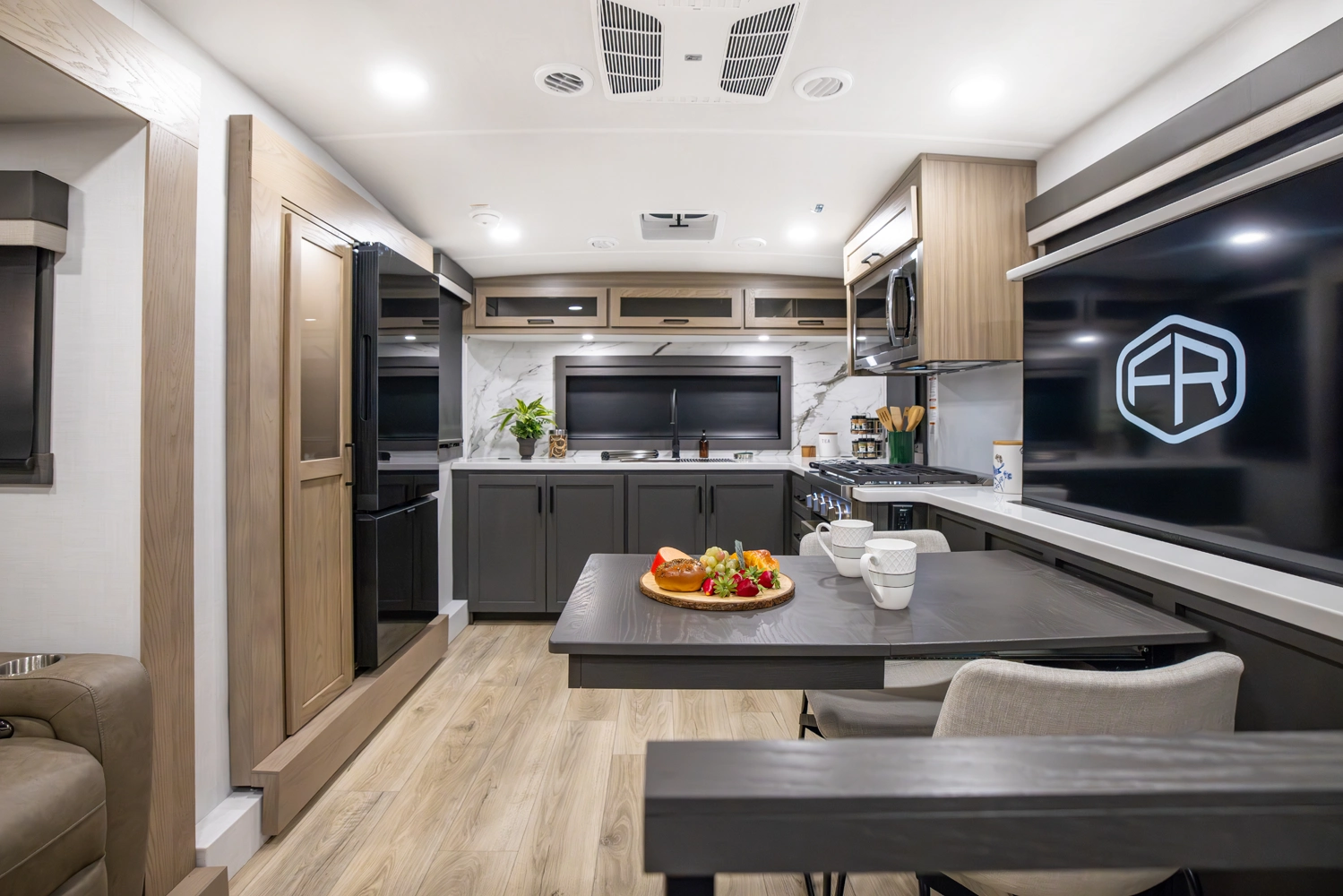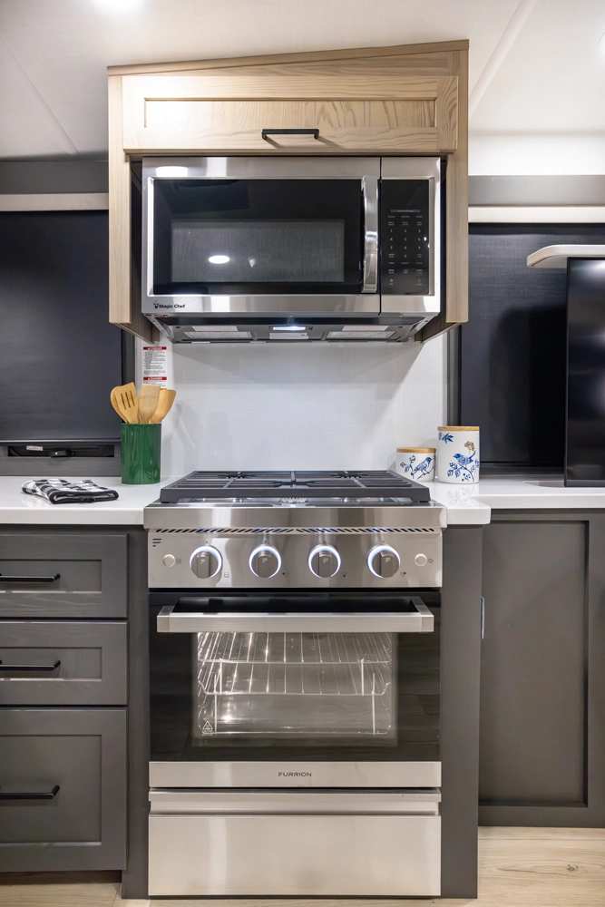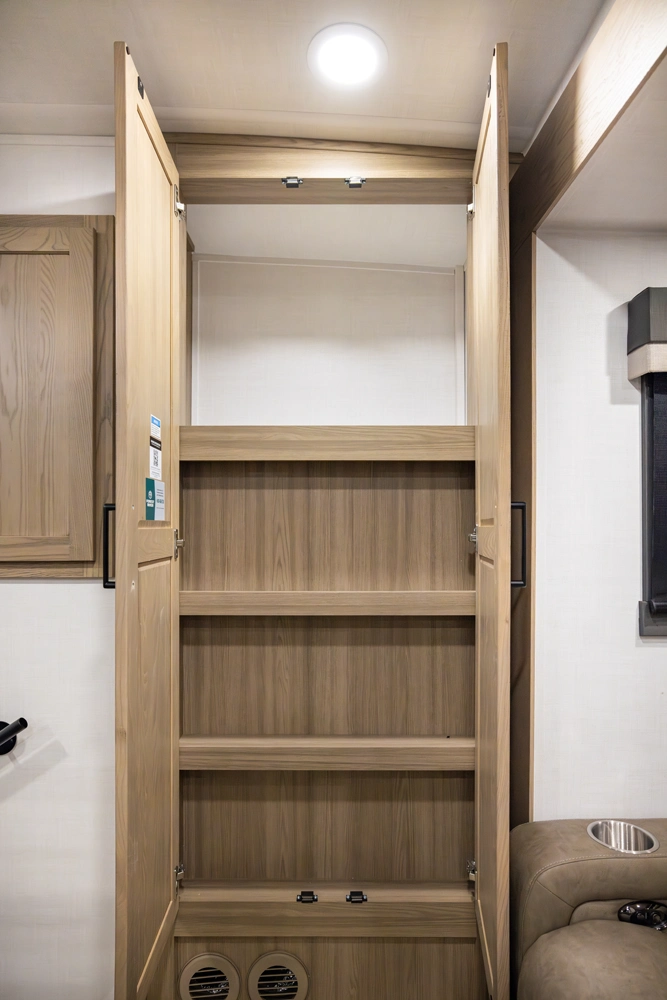 Our first front living fifth wheel under 30' delivers big luxury in a compact design! The front living area features a 60" theater seat, rotating dinette, and televator TV. The kitchen offers a full pantry, fridge, and ample counter space, while the rear bedroom includes a queen bed (king optional), wardrobe, vanity, and washer/dryer prep. With dual awnings and pass-thru storage, it’s perfect for easy towing and upscale comfort.