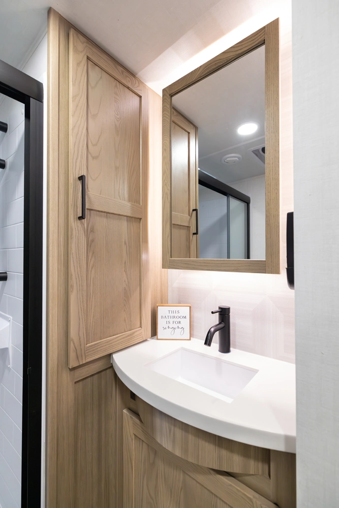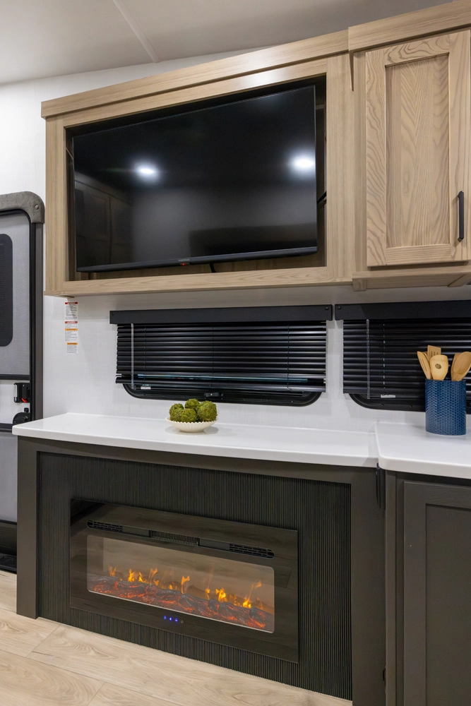 This versatile fifth wheel offers a spacious living area with a 60" hide-a-bed sofa, fireplace, and optional theater seating. The large king U-dinette converts for extra sleeping space and provides plenty of room for family meals. The front bedroom features a queen bed with an optional king upgrade and ample wardrobe storage. With a full rear kitchen, pass-thru storage, and a 21' awning, it’s designed for comfort and convenience on every trip.