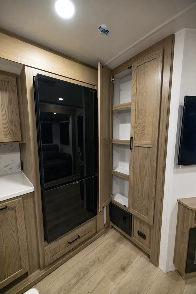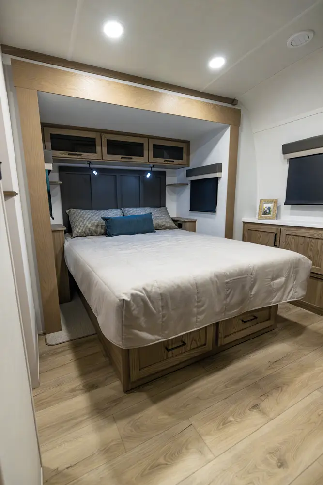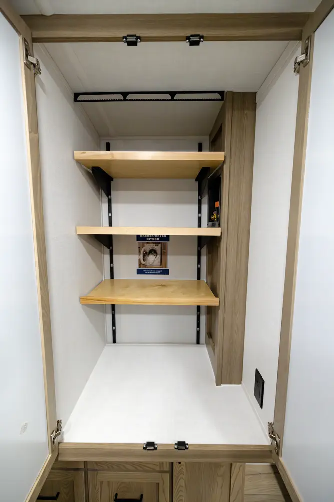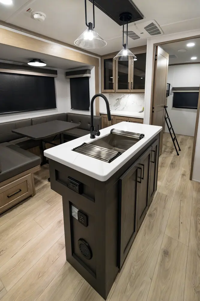 This four slide bunk model has great sleeping arrangements and a U-Dinette that can seat everyone for dinner. The outside camp kitchen has a large refrigerator and cooking stove to feed everyone you are sleeping for the trip. The bunkroom has its own entertainment and hard door for separation from the rest of the coach. The king bed option and the washer and dryer prep make this coach great on every occasion for any family.