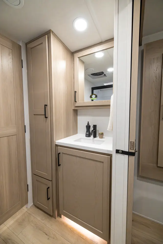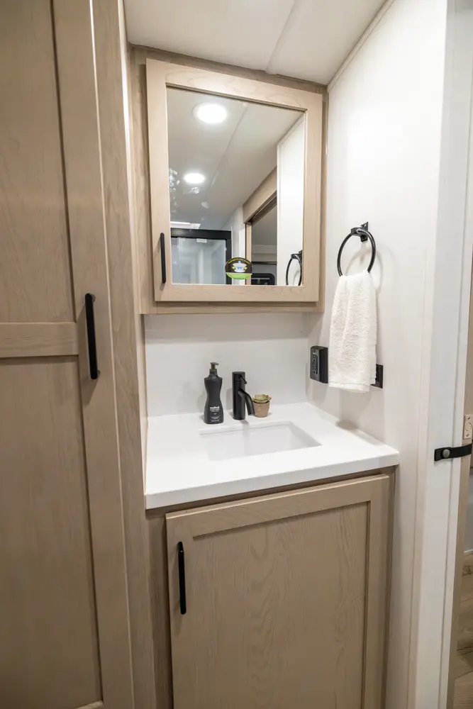 The 25SRK offers a spacious convenient layout with two entry doors providing easy access to the kitchen, bedroom, and bathroom, all while the slides are retracted. The rear kitchen features ample counter space while the living area includes a U-shaped dinette and theater seating. (optional hide-a-bed) The wardrobe slide adds generous storage making this a perfect choice for families or couples seeking flexibility and functionality on the road.