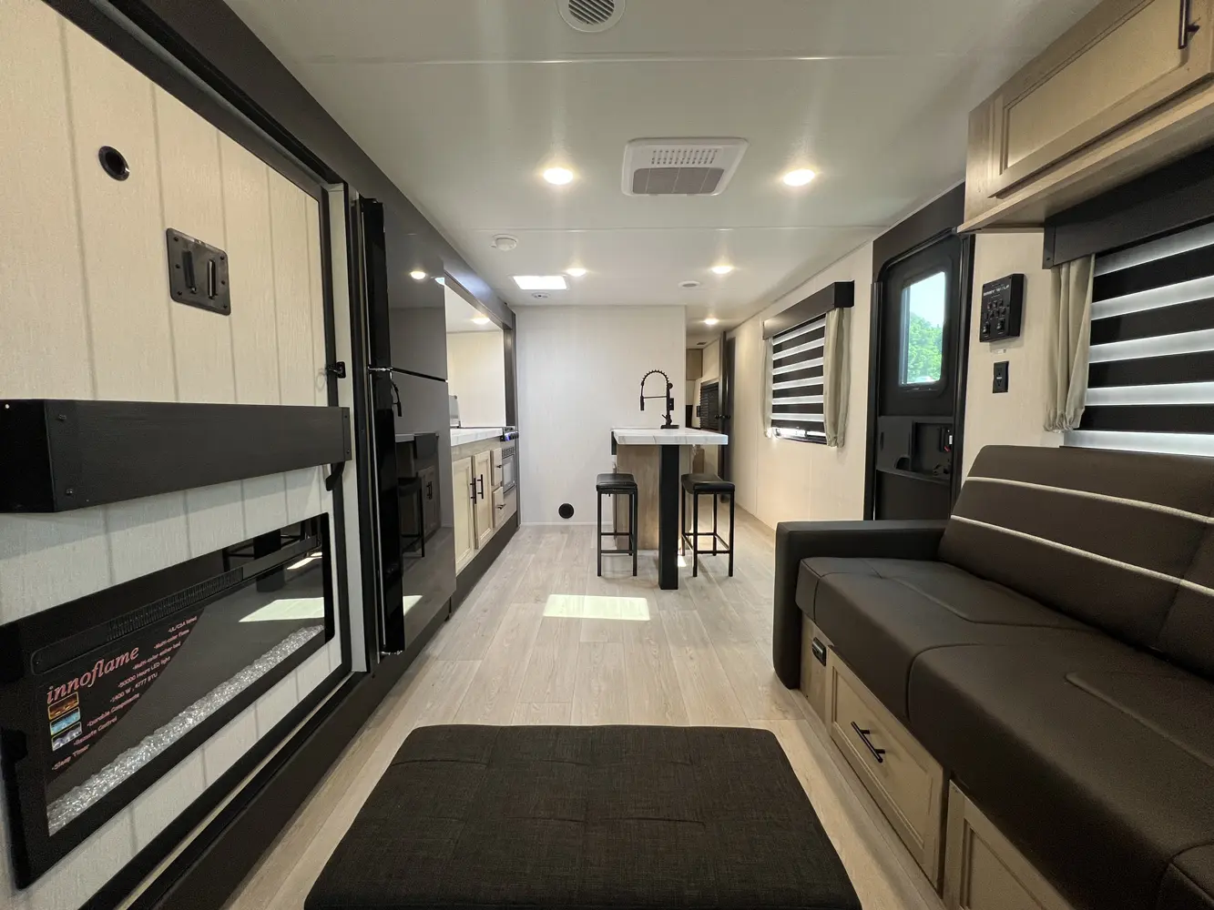 The Cherokee Grey Wolf 27LH by Forest River is a stylish and functional travel trailer with a focus on affordability, perfect for modern camping. Despite its compact 33-foot, 6-inch length, the 27LH feels incredibly spacious, thanks to its residential-style sofa and large windows that flood the interior with natural light. The bedroom is also impressive with a king size bed and plenty of wardrobe space.