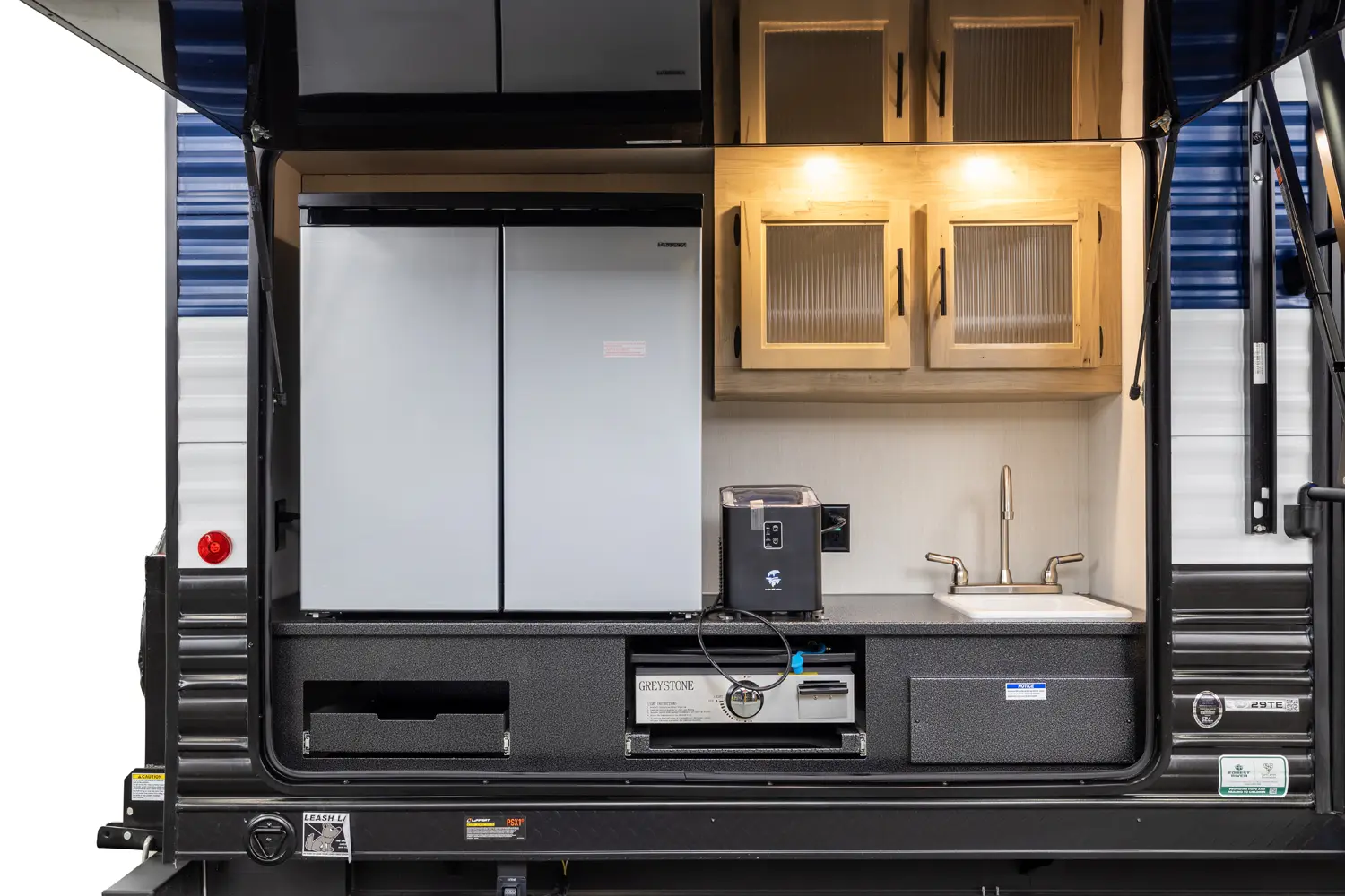 • Cherokee Black Label Grey Wolf (Deep Tinted Frameless Automotive Glass Windows, High Gloss Gel Coat Exterior Sidewalls, Multicolor Reading Lights, Pillowtop Mattress Upgrade, Power Tongue Jack, Pull Out Sprayer Faucet, Solid Surface Countertops, Thermo Foil Arctic Insulation)