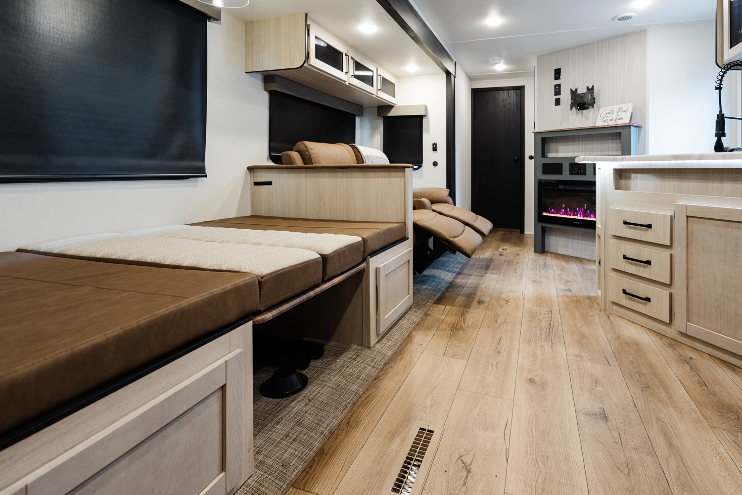 This bunk house travel trailer supplies you a great deal of space in the front bedroom. With a slide out and a large closet for all of your clothes, it will feel like your bedroom at home. The bunk house in the rear provides space for all guests to be comfortable and to make things a cut above, this floor plan provides two bathrooms. Furthermore, the exterior mini camp kitchen features a fridge and a griddle for those of you who like to cook in nature.