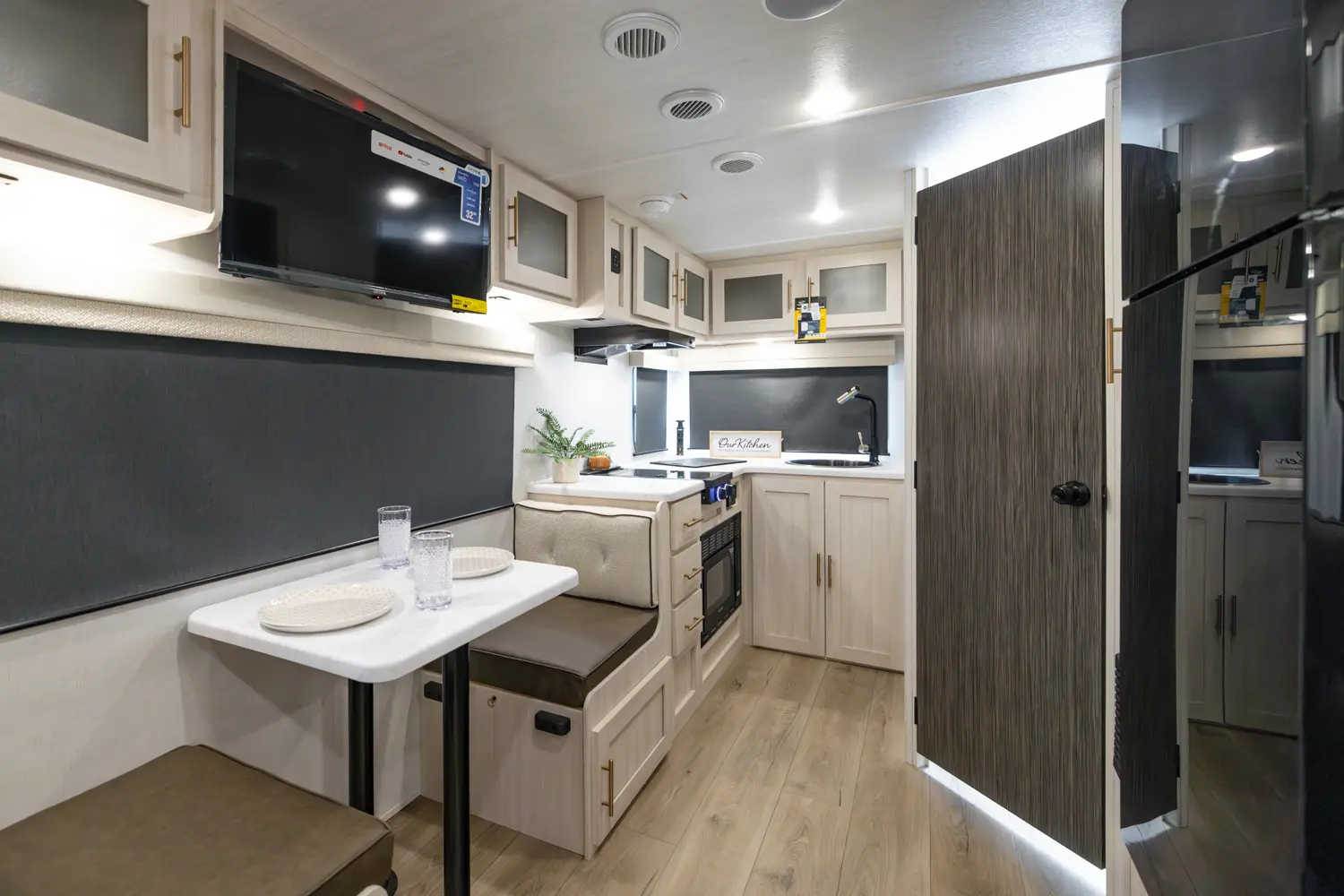 The RP-205 blends lightweight towing with a spacious layout. A private queen bedroom offers comfort and privacy, while the rear corner kitchen and booth dinette create a functional living space. The full bath adds convenience, and the theater seating enhances comfort. With modern finishes and smart storage, this no slide trailer is ideal for couples or small families seeking compact, full-featured adventures.