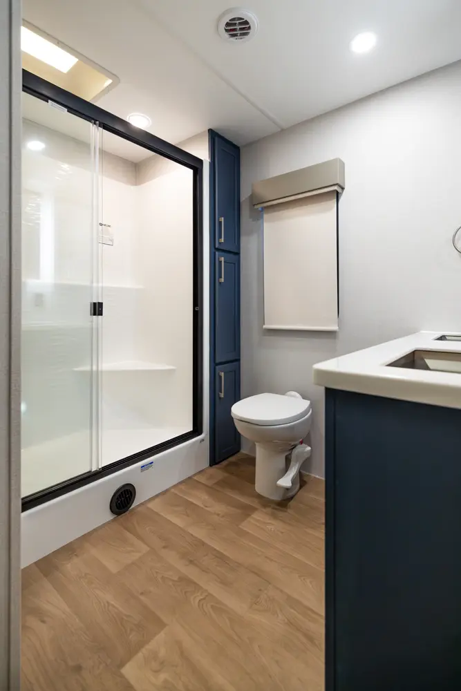 The 393RL is the biggest couples coach River Ranch has to offer. This floorplan provides a large bedroom with a king size bed. The full-length closest provides the most interior storage of any floorplan offered. The kitchen provides residential-style appliances, including a fridge with ice maker, 24” 4 burner range with oven, 30” microwave and dishwasher prep for an 18” residential dishwasher in the island. It has a plush 88” tri fold 50/50 split sofa, theater seat and 50” entertainment TV.