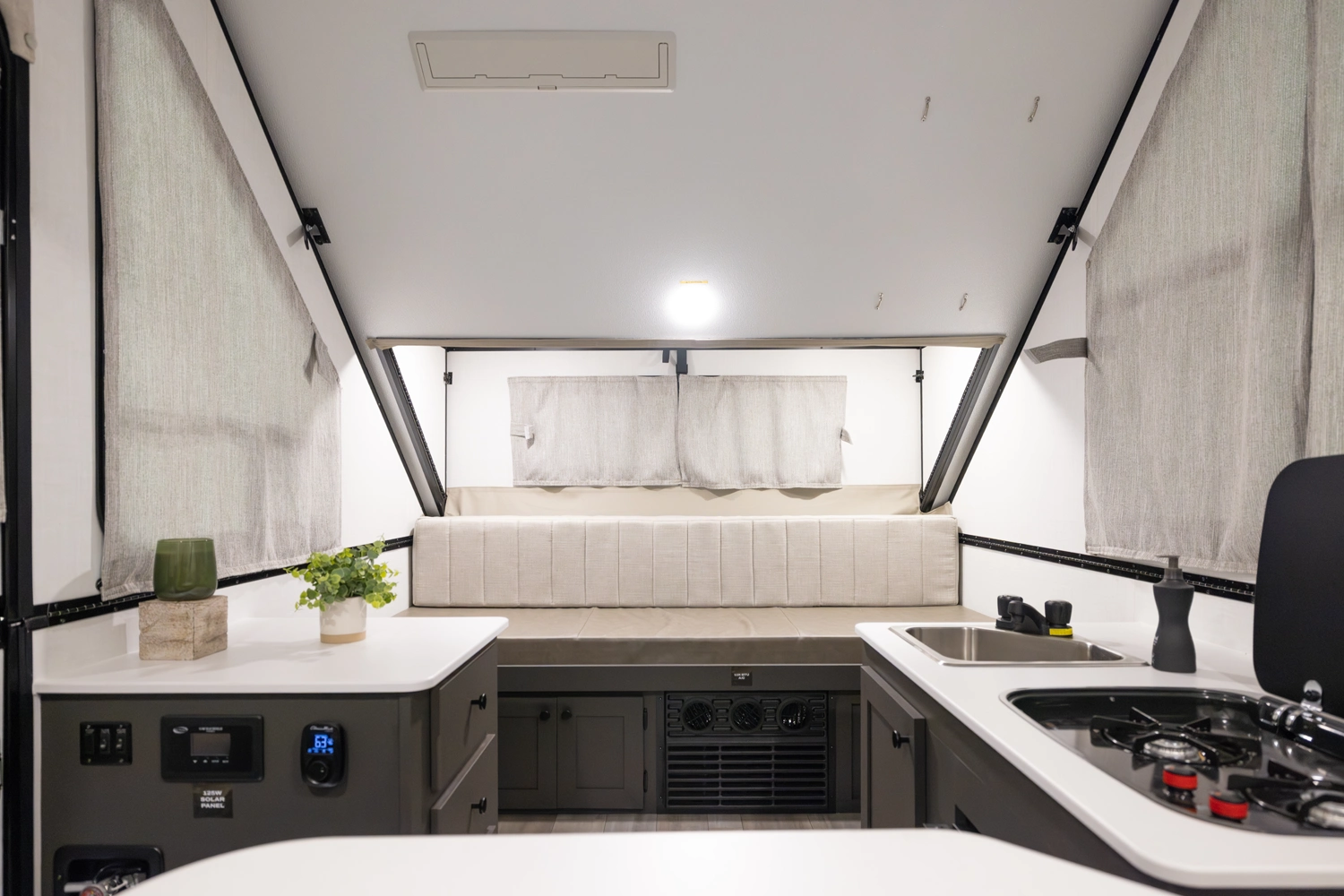 The Rockwood A121FD is a thoughtfully designed A-frame camper that maximizes space. It features a front 45" x 80" dinette, perfect for dining and relaxing. In the living area, you'll find a sink, cooktop, and small refrigerator. At the rear, a spacious 54" x 80" gaucho bed awaits, and with a double dormer, you get increased head height on both sides for extra comfort.