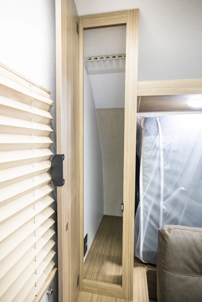 The 167RBK is just over 3,000 lb. of compact, yet feature-packed fun! The queen bed in front flips up to provide sofa space during the day, with end tables for extra storage and convenience. The booth dinette and large window give you great breakfast views, while the large rear bathroom provides a bit more elbow room than you'd expect—plus a bonus linen cabinet!